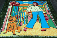 盲導犬の里である静岡県富士宮市の日本盲導犬総合センター「富士ハーネス」に於いて、日本盲導犬協会設立40周年記念のメモリアルチャリティイベントとして、インフィオラータが開催されました。 「いつでも、どこでも、安全で快適な盲導犬歩行」をテーマに、視覚障害の方々や地元の小学生をはじめ近隣の方々、150名で5枚の花絵を創作されました。 |