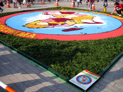 横浜赤レンガ倉庫イベント広場で、アフリカン・フェスタ2010が開催され、21万人もの来場客で賑わいました。 ケニアから輸入した3,000本のバラの花びらと弊社カラーサンドを使用して、直径7mのアフリカ大陸の地図を来場者の皆様と創作致しました。 |