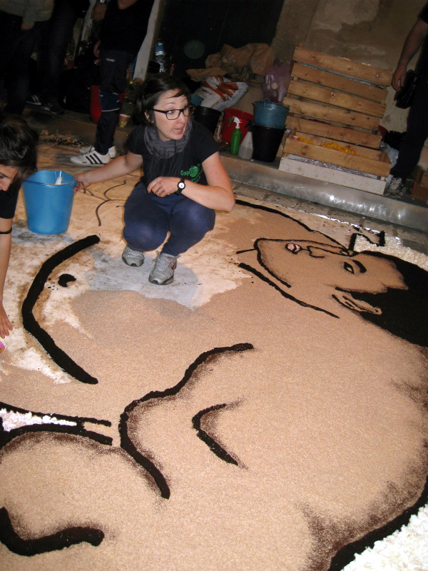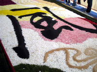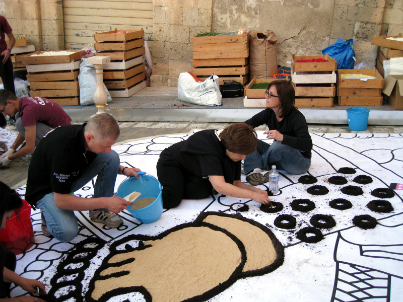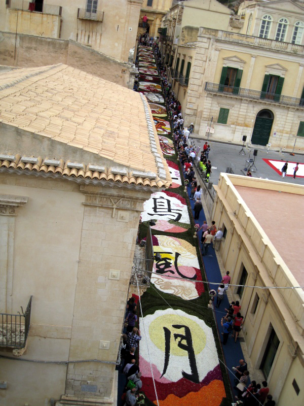 世界遺産の街、イタリアのノート市でインフィオラータが開催され、弊社からも日本を代表して参加致しました。 弊社カラーサンドと花びらを使用して、日本をテーマにした16枚の作品の内、8枚の作品を日本チームが制作致しました。 |