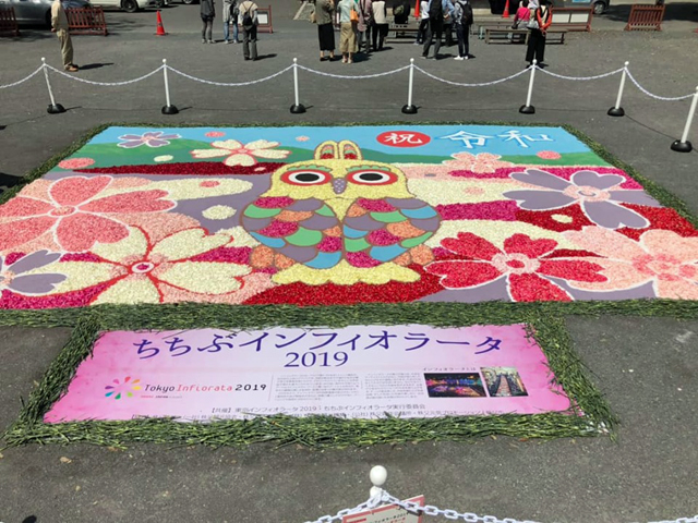 と花びらを使用して、新元号の令和と秩父ゆかりのフクロウ・シバザクラをデザインにした大きな花絵を創作し、新たな時代の始まりを祝福しました。