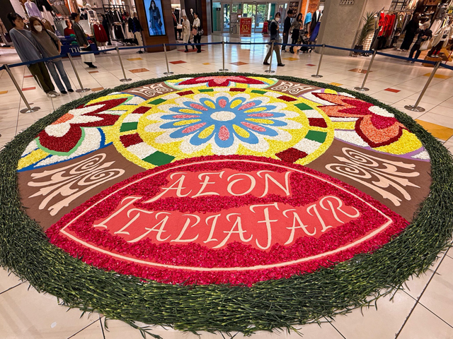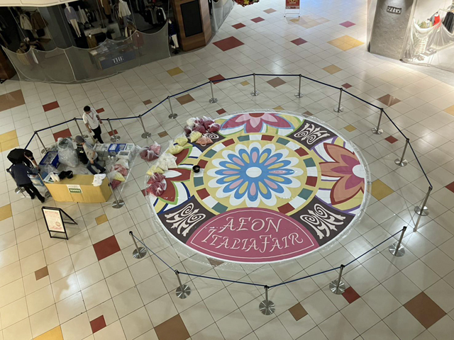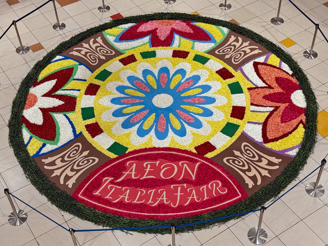 埼玉県越谷市にある、イオン レイクタウン moriに於いて、イオン イタリアフェア みんなで作る花のアート「インフィオラータ」が開催されました。 弊社カラーサンドと花びらで、イタリア式庭園と噴水をモチーフにした花絵を作成しました。 |