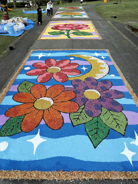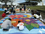 石川県鳳珠郡能登町のやなぎだ植物公園に於いて、インフィオラータが開催されました。 弊社カラーサンドと震災や洪水被害で出た廃材を色付け加工したウッドチップを使用して、60名の能登町民の方々と「お花」をテーマにした4枚の花絵(100平米)を創作しました。 |