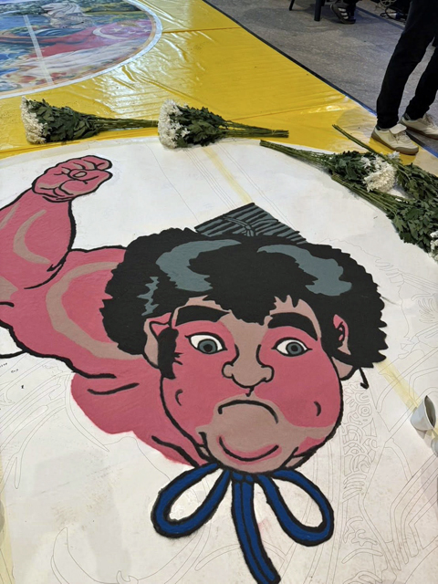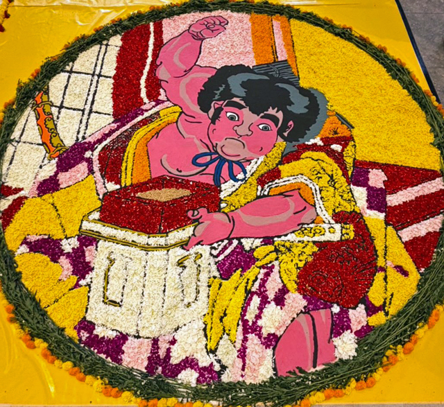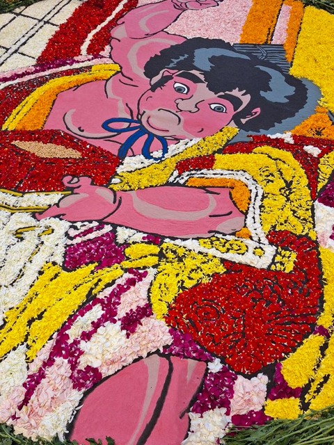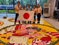 シンガポールでフラワーカーペットが開催されました。 日本代表として、弊社カラーサンドと花びらを使用して、金太郎の豆まきをモチーフにした直径3.5mの花歌舞伎の作品を描きました。 |